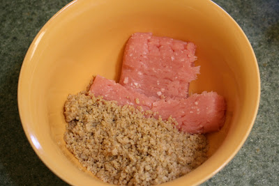 Preheat your grill on hight heat. Add equal parts of ground turkey breast and cooked quinoa to a bowl.